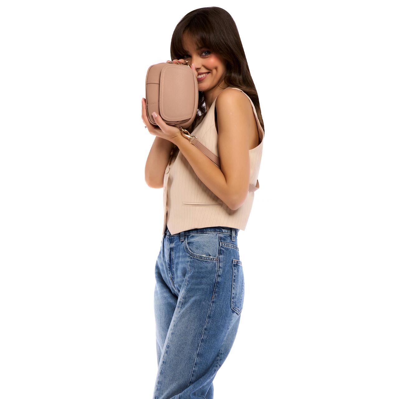 O poți purta ca geantă de mană cu lanțul împletit, când vrei un accent poshy. Dar si casual, ca geantă de umăr, când ziua te duce prin cafenele, muzee sau alei de city break.